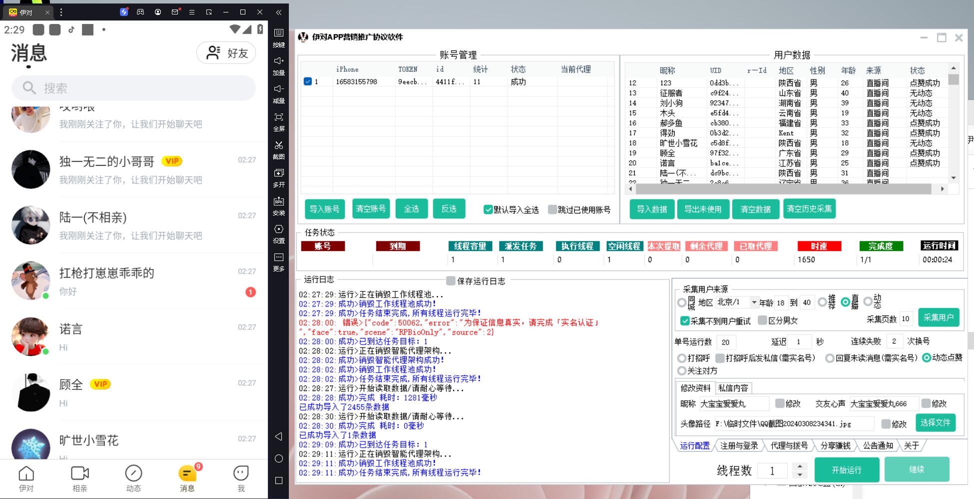 [私信推广软件] 伊对APP推广引流协议软件 自动注册账号采集用户 打招呼 回复私信 关注点赞等功能