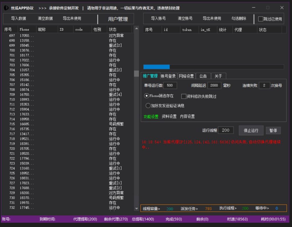 丝瓜APP是前身是MosGram和泡泡软件,之后改名为丝瓜APP,有接触过的朋友应该都清楚,这里就不多说了 软件功能介绍:1️⃣ 账号登录软件支持使用账号密码登录+短信验证,登录成功后自动获取账号的token参数,下次无需登录即可使用该账号进行操作 2️⃣ 手机号检存软件支持本地过码无需登录账号即可批量检存手机号是否存在丝瓜APP,存在则保存,不存在则过滤掉,保留精准的存在用户